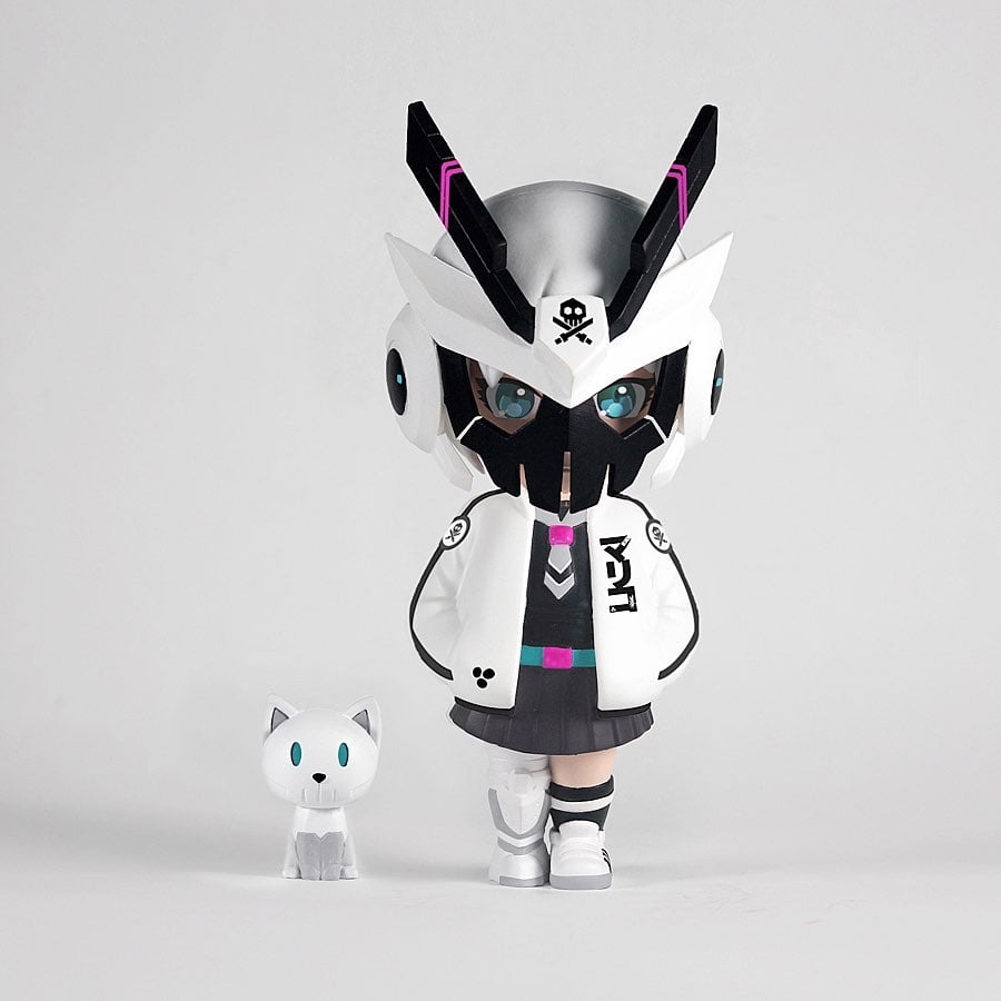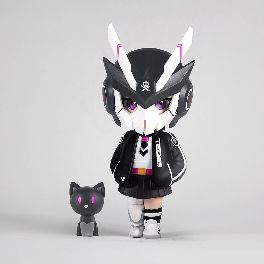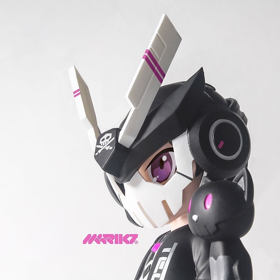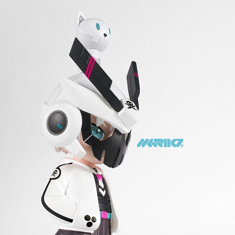 Tired of letting the boys have all the fun, Mariko has arrived. QUICCS‘ heroine is ready for her debut from Devil Toys in both OG Black & Ghost White Editions. The latest member of the Bulletpunk family features a removable TEQ-like mask and street smart school girl outfit. Mariko (5.2″ w/mask) is also accompanied by her Necco (1.5″), her loyal mecha cat. To our knowledge, Mariko marks the first time QUICCS has lifted the skull mask to reveal the warrior beneath. While getting humans right within the constraints of vinyl toy deco can be difficult, many collectors will likely choose to display Mariko without her mask.